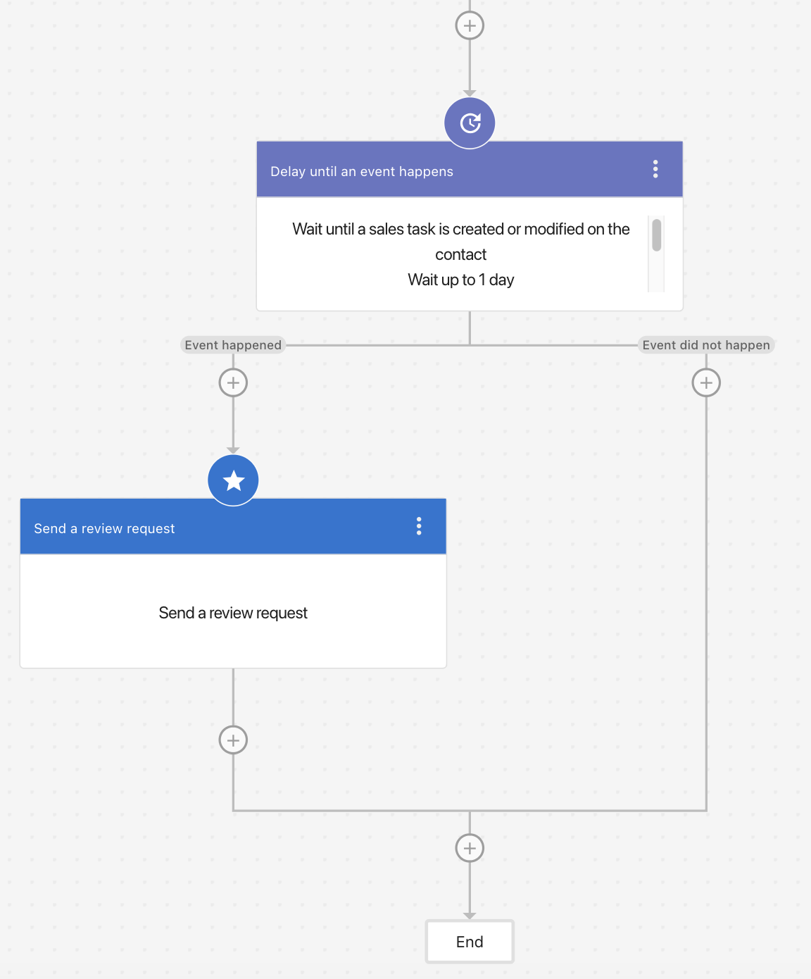 - Delay until: A sales task is created or modified on the contact (wait up to 1 day)
