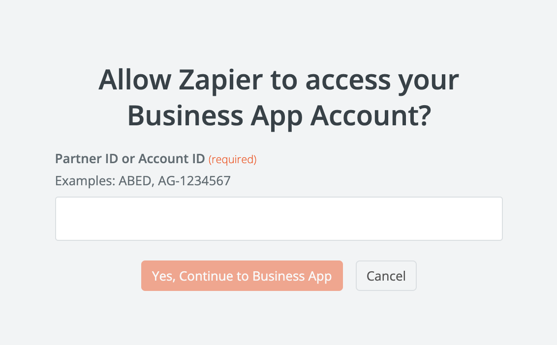 - Zapier will prompt you to enter your Account ID. Enter your Account ID (from step 3), then click