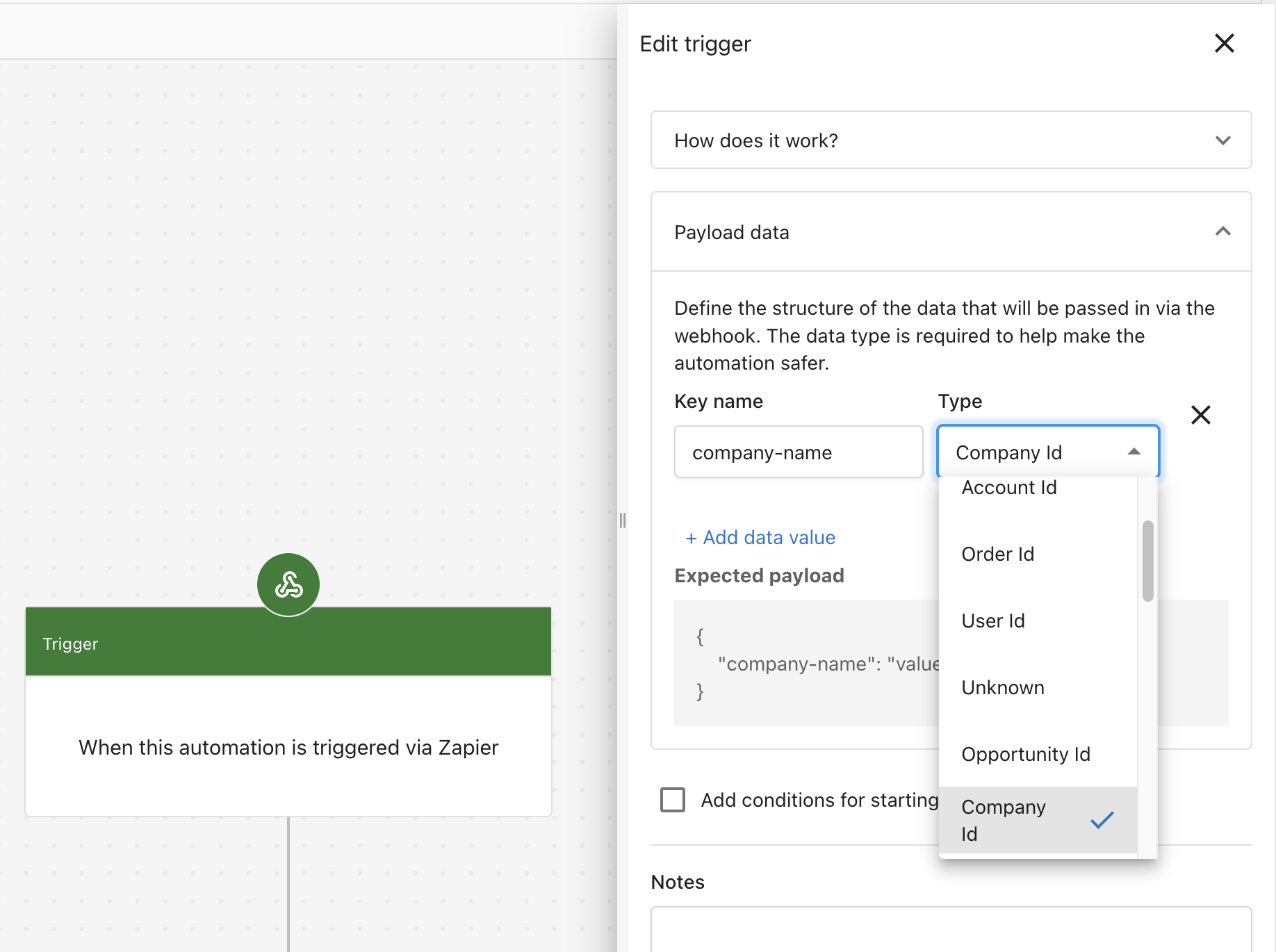 Step 4: Define your Payload data. This is the data your external app will send to Business App when the automation runs. For each piece of data, enter a Key name (make it descriptive, like company-name) and select its Type.