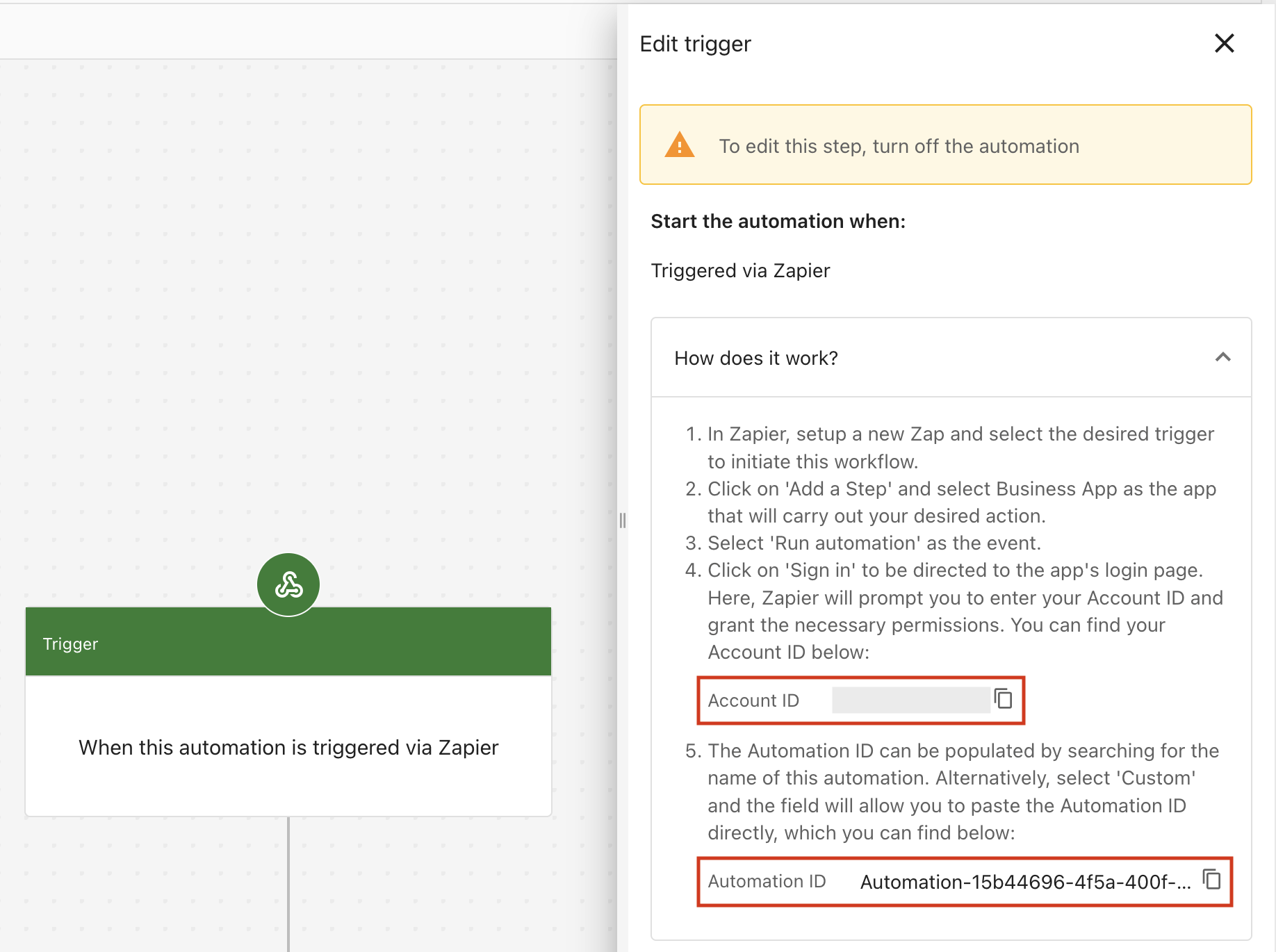 Step 3: In the trigger's side panel, note your Account ID and Automation ID. You'll need both when setting up the Zap in Zapier.