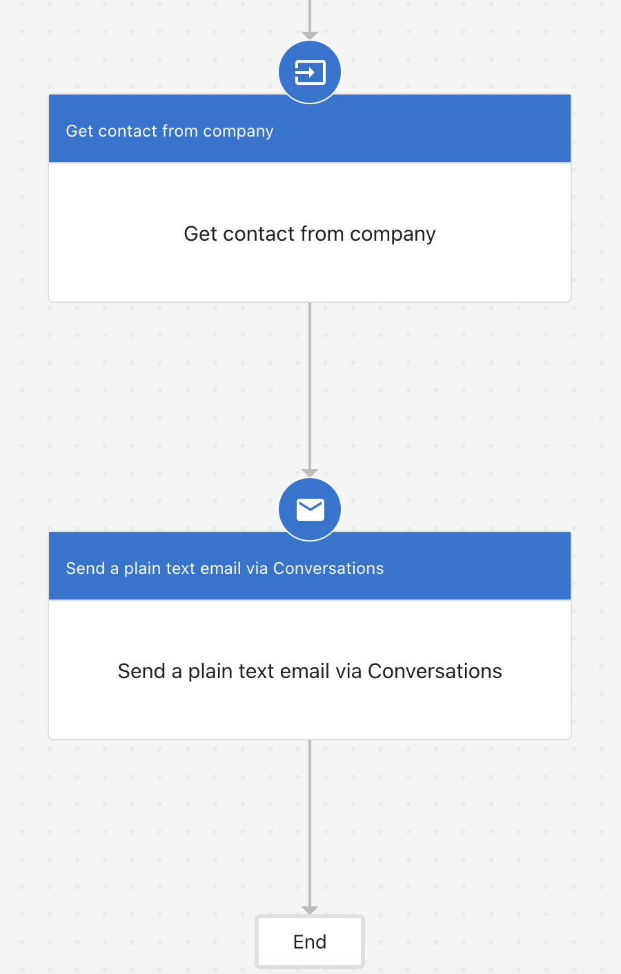 Step 5: Add the steps you want the automation to run. Because the payload only provides a company name, you can't send an email directly. You first need to identify who to email. Add a Get contact from company step to retrieve a contact at that company, then add a Send a plain text email via Conversations step to send them the confirmation.