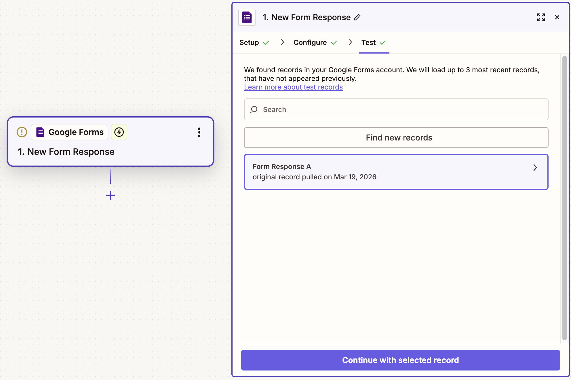 The steps below use Google Forms as the example trigger app. Your external app (Google Form, QuickBooks, etc.) should already be set up and collecting data before you begin.