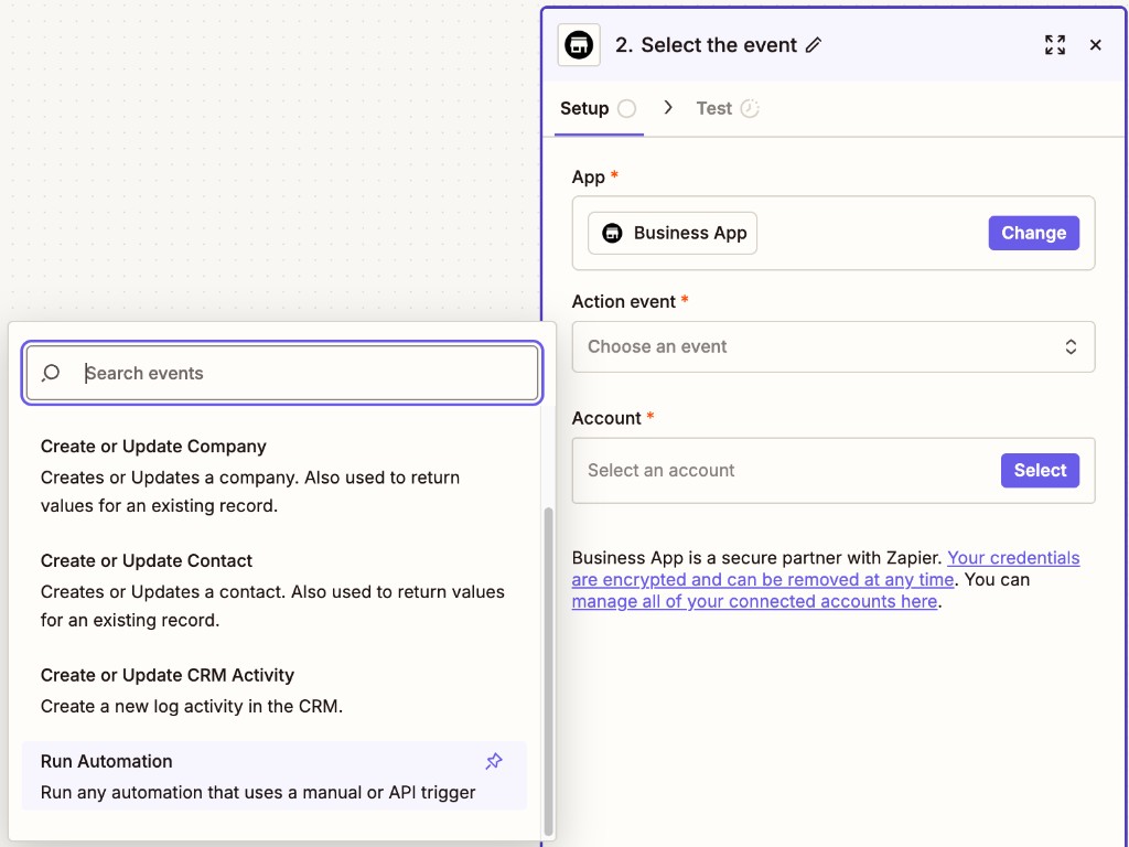 Step 10: In the Account field, click Select to connect your Business App account. You'll be redirected to a login page where you'll enter your Account ID and grant the necessary permissions. After that, you'll be returned to Zapier automatically.