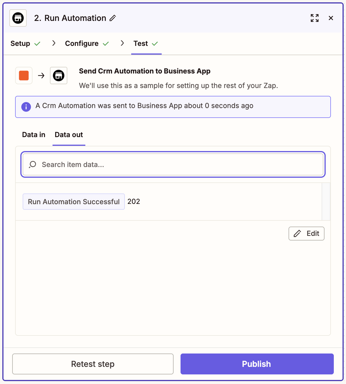 Step 13: Before publishing the Zap, use Zapier's test feature with a sample Google Form response to confirm everything is working. A Run Automation Successful message confirms the automation ran correctly in Business App.