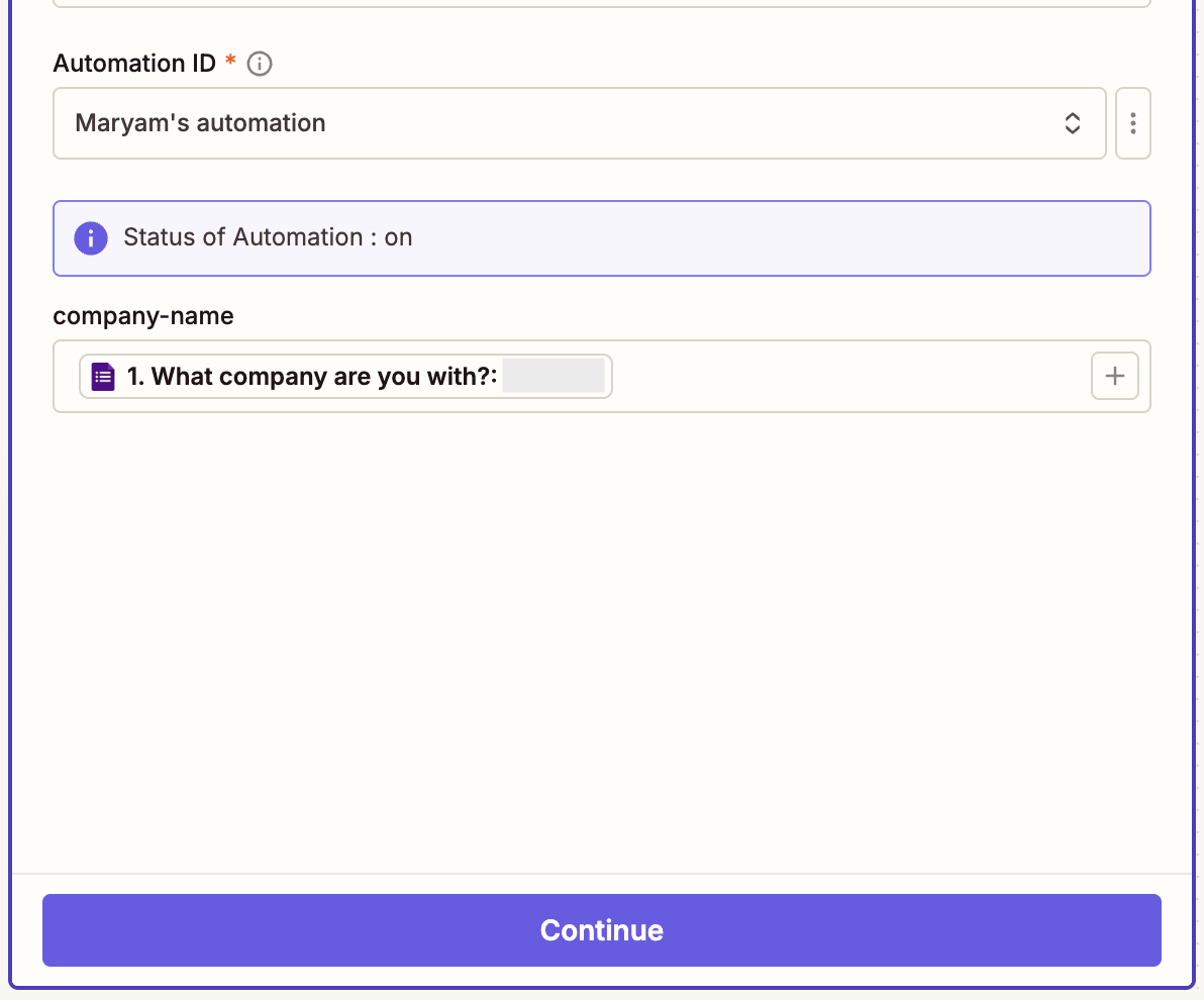 Step 12: Once the automation is selected, the payload data fields you defined in Part 1 appear below. Map each field to the corresponding value from your trigger app. In this example, map company-name to the Google Form question that collects the company name. This tells Zapier exactly which piece of incoming data to pass to Business App.