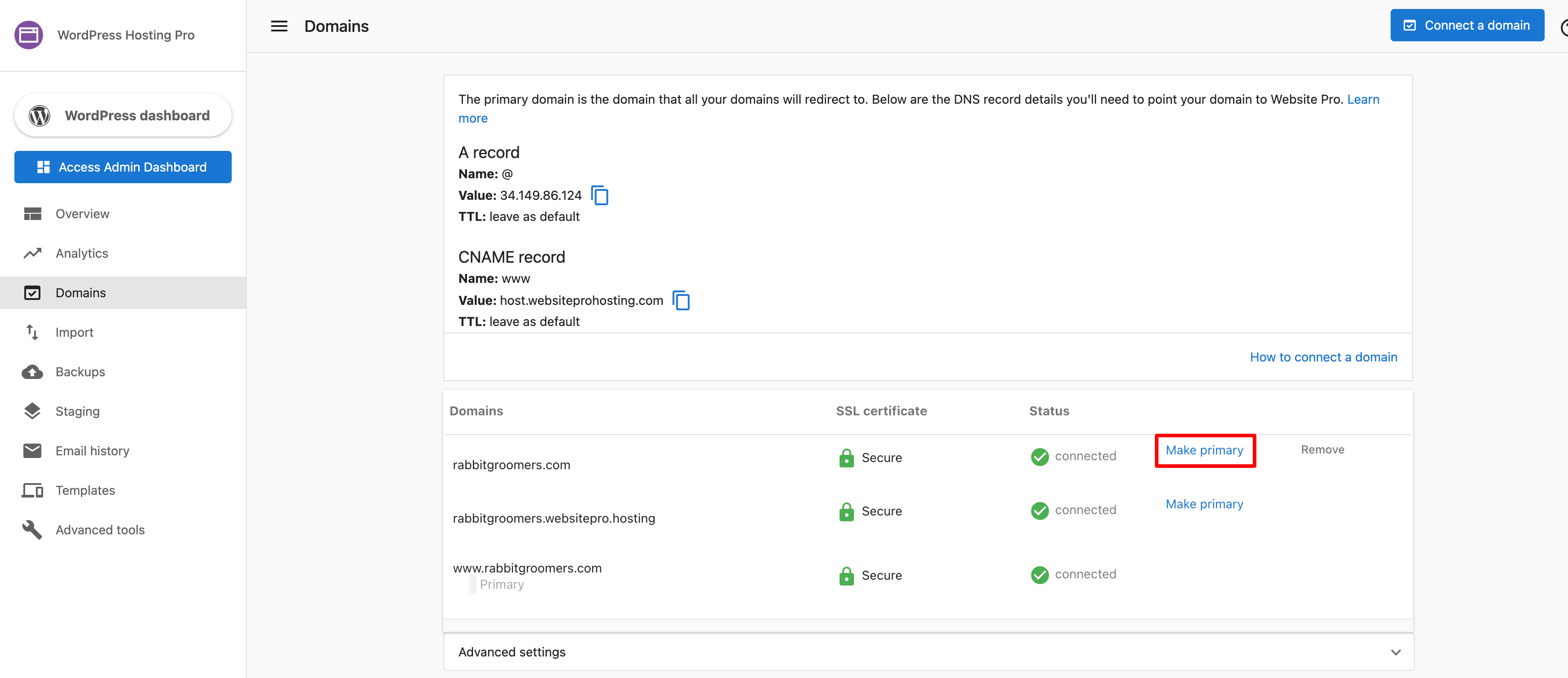 Select the Make Primary button next to the domain you want to use. This will make it so that when the site is accessed from any of its connected domains, the user is redirected to your primary one.