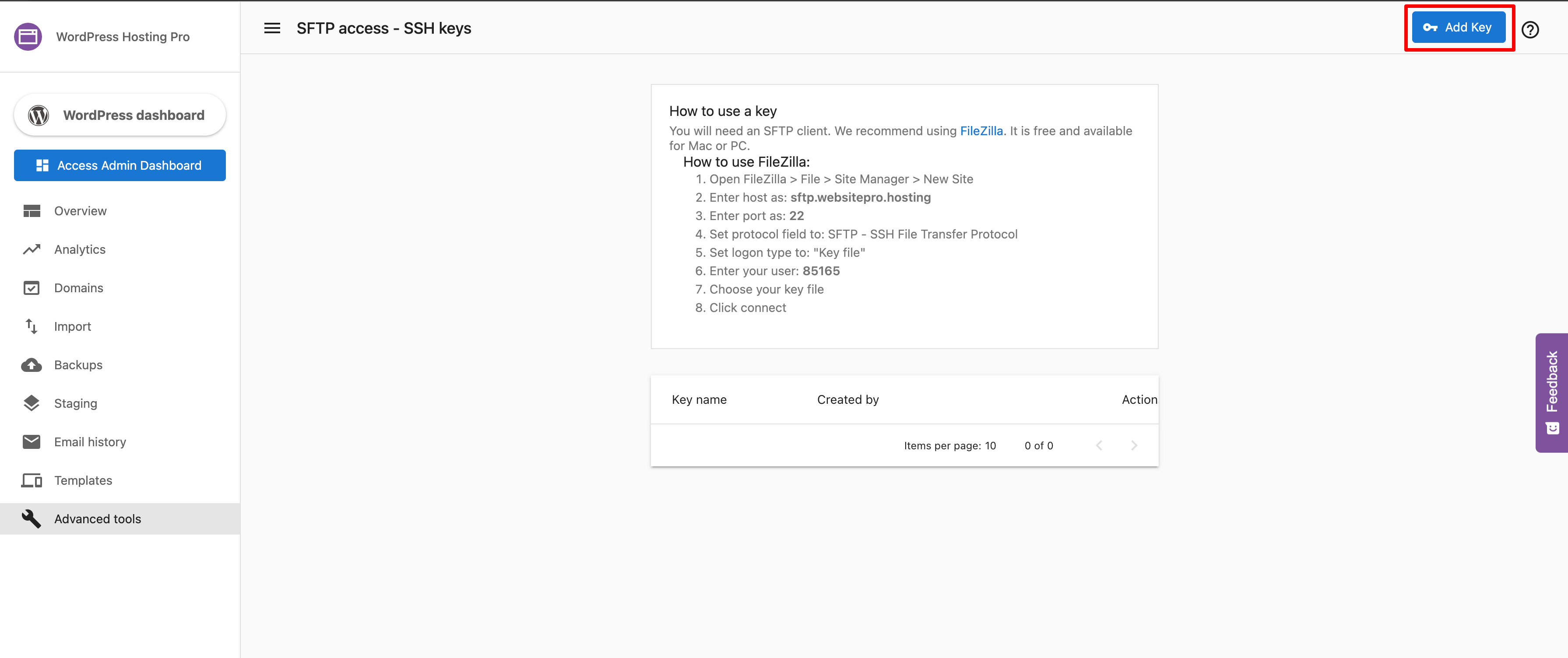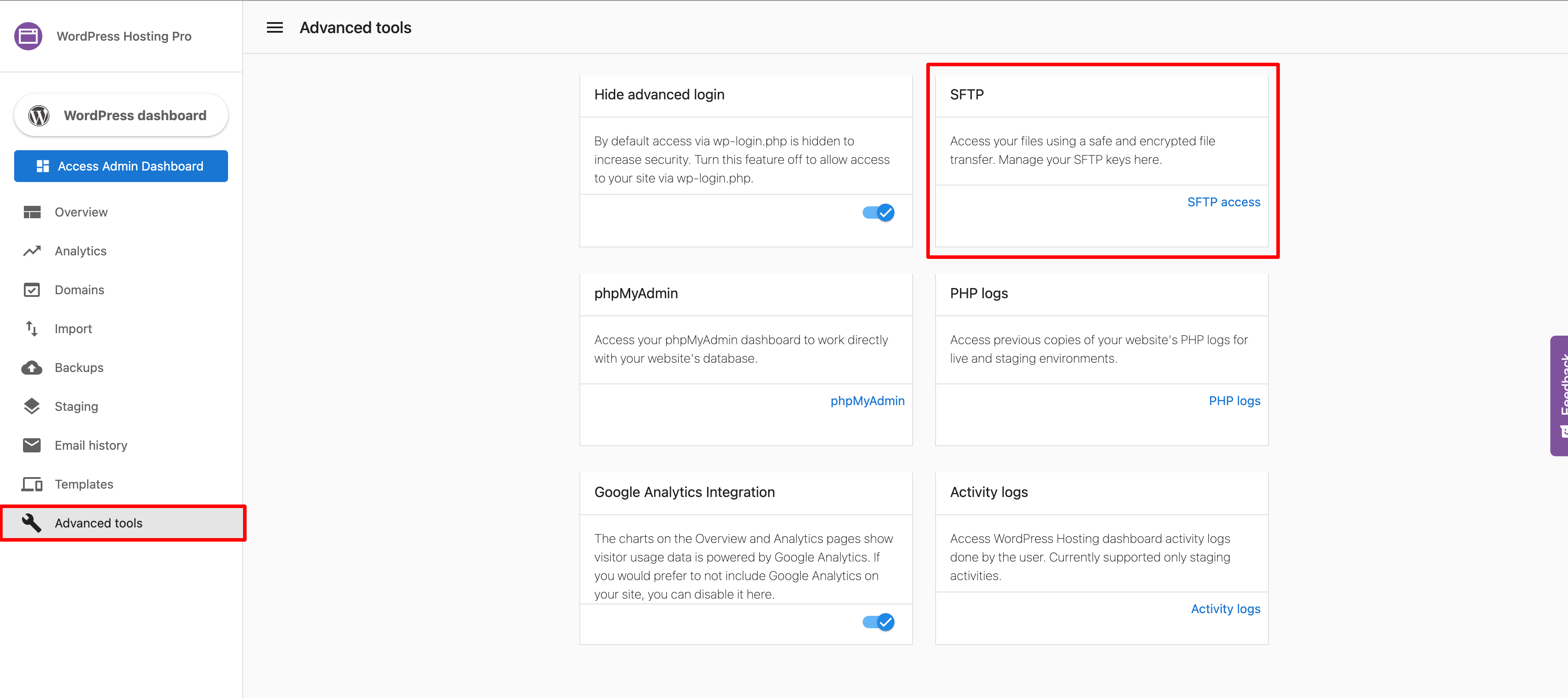 Go to your WordPress Hosting Pro Dashboard and find the SFTP section.