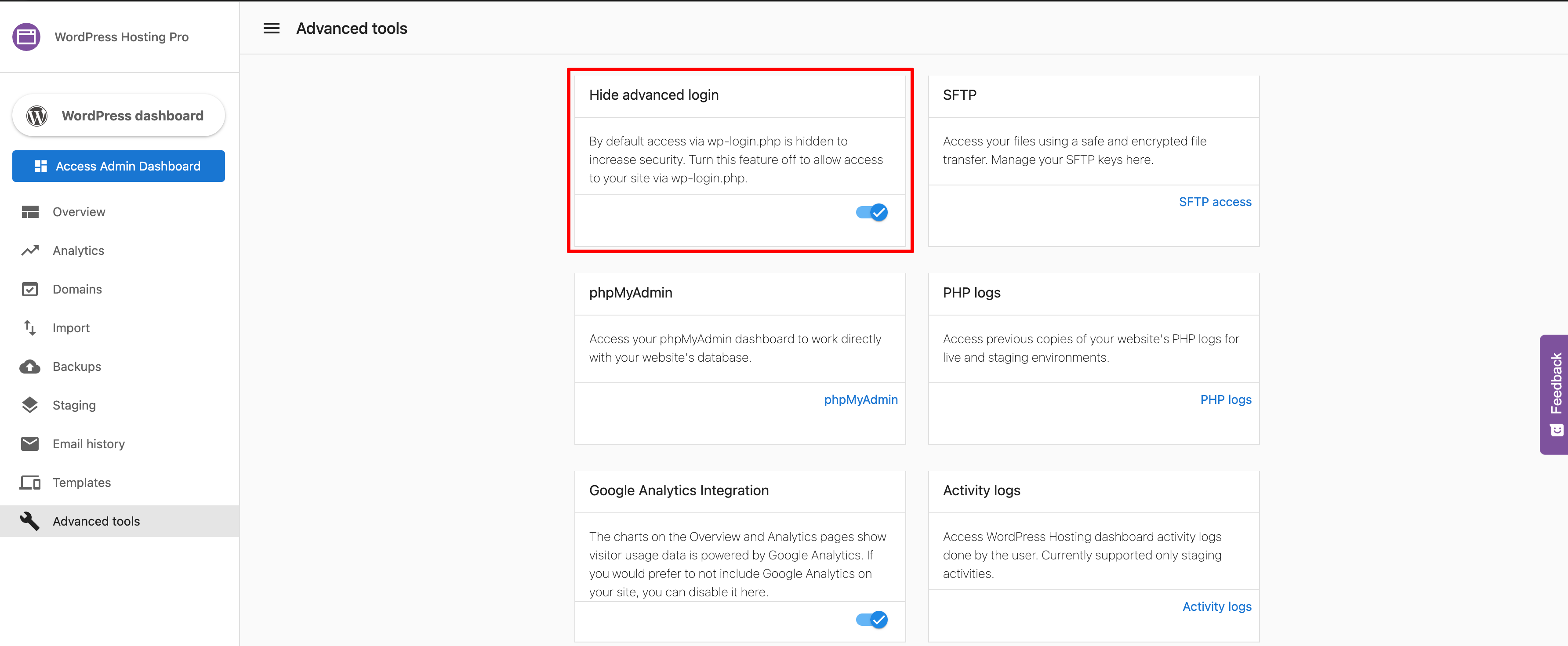 To disable the WordPress Hosting Pro login override, toggle off Hide Advanced Login under Advanced Tools in the WordPress Hosting Pro dashboard.