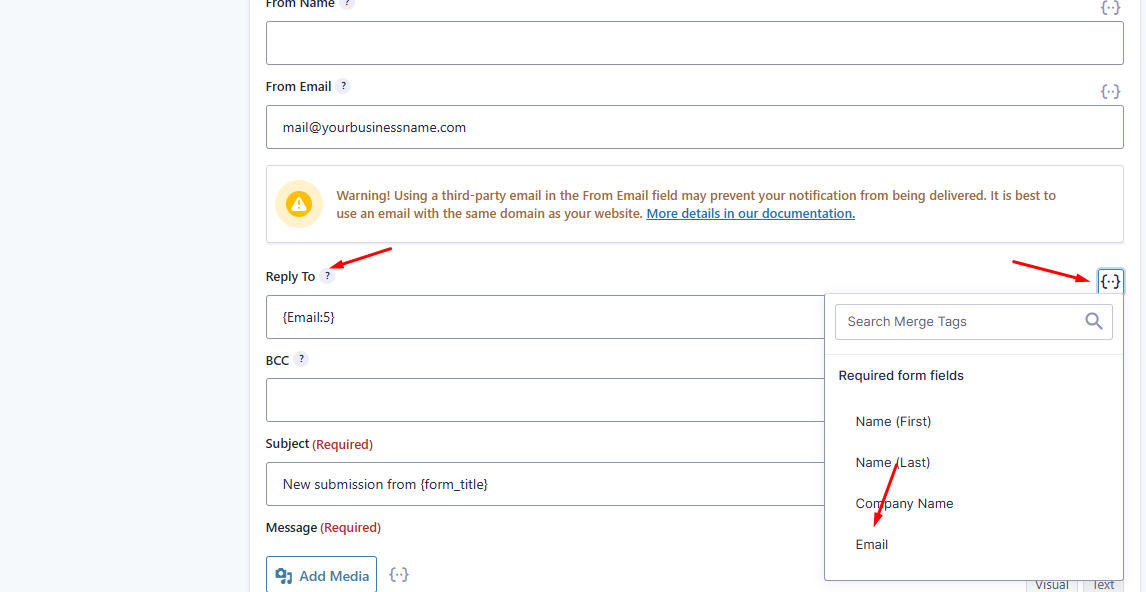 To prevent emails from being flagged as spam or failing delivery, you must configure both the "From Email" and the "Reply-To Email" correctly.