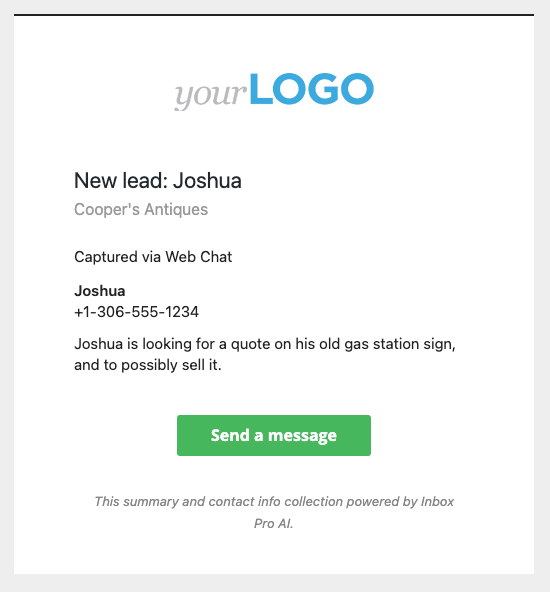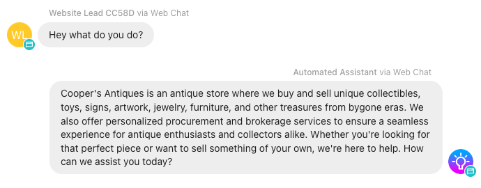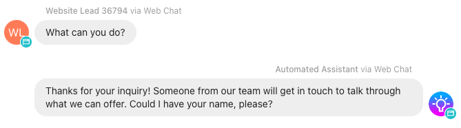 By default, the AI assistant “just works” with the goal of capturing lead contact info, even without any context or knowledge about the business website it has been installed on – it will engage with a website visitor, recording their question and needs, attempt to get their name and contact info (mobile number, with a fallback to email address) and alert the business that they have a new lead.